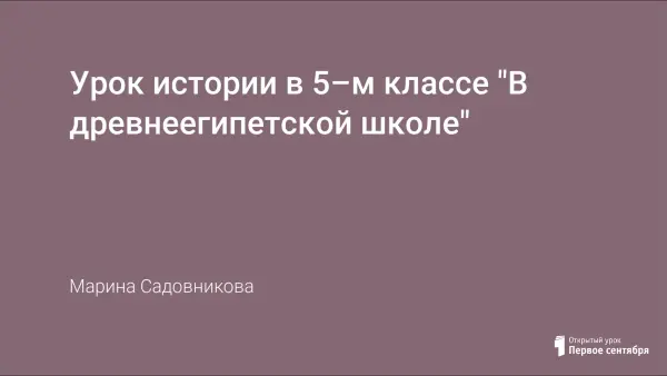 Форма урока - путешествие во времени. Учащиеся представляют себя учениками древнеегипетской школы. Учитель проводит четыре урока: письмо, арифметика, геометрия, астрономия, на которых раскрываются особенности египетской письменности, показаны ее сложности. Дети знакомятся с историей ее дешифровки. Пятиклассники узнают особенности египетского счета и системы мер. Работают с таблицей, сравнивая древнеегипетский и современный календарь.