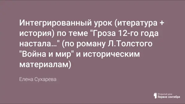 Предлагаемый автором урок поможет учащимся сравнивать взгляды историков и писателей, проследить изображение Отечественной войны, исходя из взглядов Толстого на историю. Основная цель работы – развивать чувство патриотизма на ярких примерах героизма русской армии, приобщить к архивным материалам, литературным и историческим источникам.