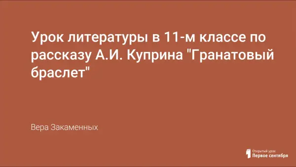 На занятии учащиеся углубляют представления о художественном своеобразии прозы А.И. Куприна, знакомятся с историей создания рассказа "Гранатовый браслет". На основе непосредственных впечатлений от прочтения рассказа проводят комплексный анализ произведения.