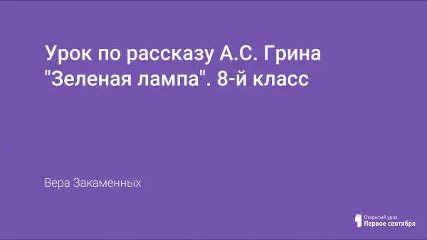 Цели урока: познакомить учащихся с жизнью и творчеством А.С. Грина; остановившись на анализе и изучении рассказа "Зелёная лампа", рассмотреть систему образов, подчеркнуть особенности рассказа в композиционном плане и определить тему и идею рассказа "Зелёная лампа"; развивать умение анализировать художественное произведение: давать характеристику героям, сопоставлять факты и делать самостоятельно выводы.