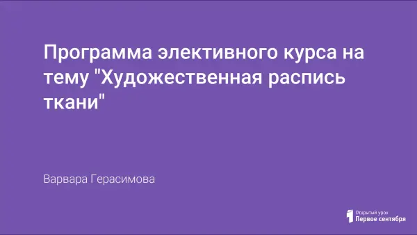Представленная автором программа призвана помочь старшеклассникам, имеющим склонность к декоративно-прикладному искусству, реализовать свои природные задатки в одном из популярных его направлений - художественной росписи ткани.