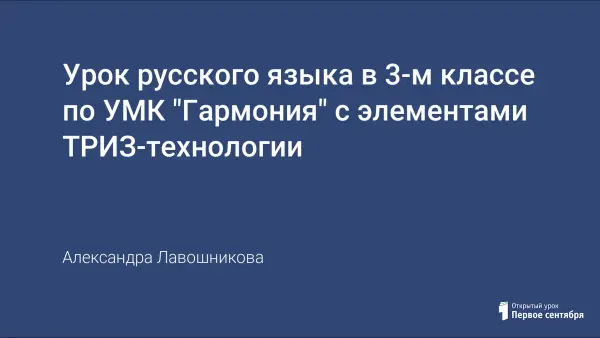 Урок русского языка в 3-м классе по УМК «Гармония» с элементами ТРИЗ-технологии. Цель – обеспечить полноценное усвоение знаний одновременно с развитием интеллекта и творческих способностей. Освоение ЗУН осуществляется преимущественно в форме деятельности. Урок построен таким образом, что один вид деятельности сменяется другим – это позволяет сделать работу детей динамичной, насыщенной и менее утомительной.