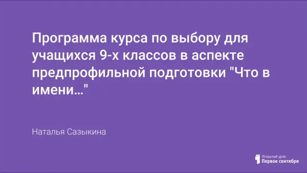 Этот курс – синтез межпредметных связей: русский язык, литература, история, география. Курс ориентирован на то, чтобы, углубляясь в ономастику, дети больше узнали о лексической, языковедческой стороне родного языка, умели свободно получать необходимые знания, работая со специальной литературой, расширять свой кругозор. Курс рассчитан на 12 часов, предназначен для предрофильной подготовки учащихся 9-го класса.
