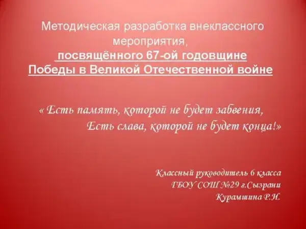 Внеклассное мероприятие, посвященное 67-й годовщине Победы в Великой Отечественной войне "Есть память, которой не будет забвения, есть слава, которой не будет конца!"