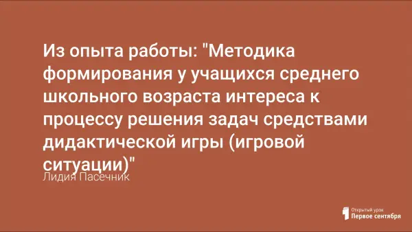 В предлагаемой статье описан опыт создания методики, в которой сконструирована система игр (игровых ситуаций) для использования на уроках математики с целью формирования познавательного интереса учащихся среднего школьного возраста; построена этапная методика обучения математике в условиях активного усвоения содержания, одним из компонентов которой является дидактическая игра (игровая ситуация); представлены адекватные целям гуманизации приемы организации работы с классом.