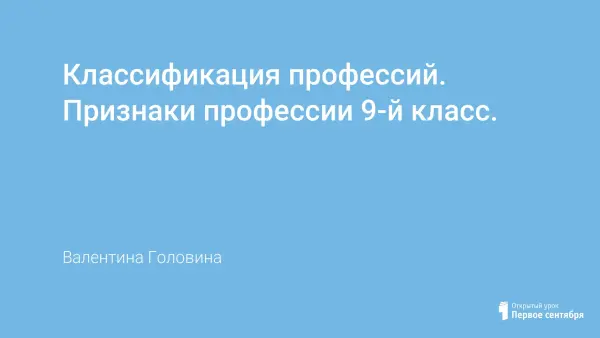 Признаки профессий на основе теории Е.А. Климова: каждый вид труда имеет следующие компоненты — предмет, цель, орудия и средства, условия труда. Объяснение темы ведется с помощью презентации, выполненной в PowerPoint, эта презентация является приложением к статье. В разработке есть практические задания и контрольные вопросы.