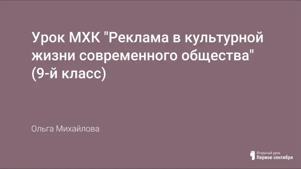Урок ставит своей целью формирование у учащихся представления о рекламе как неотъемлемой части массовой культуры, синтезирующей различные виды искусства. Основу урока составляет лекция преподавателя с использованием ИКТ и работа учащихся в малых группах с различными источниками художественной информации. Основные вопросы: Что такое реклама? Каковы ее функции? Каковы черты рекламы как вида искусства? Эволюция рекламы как вида искусства.