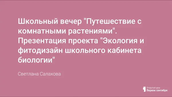 Внеклассное мероприятие "Путешествие с комнатными растениями" (презентация проекта "Экология и фитодизайн кабинета биологии") - это результат учебного занятия, построенного по технологии проектного обучения. Планируемый результат: ученики разрабатывают проект фитодизайна школьного кабинета биологии; создают проект; моделируют результат проекта и презентуют его аудитории.