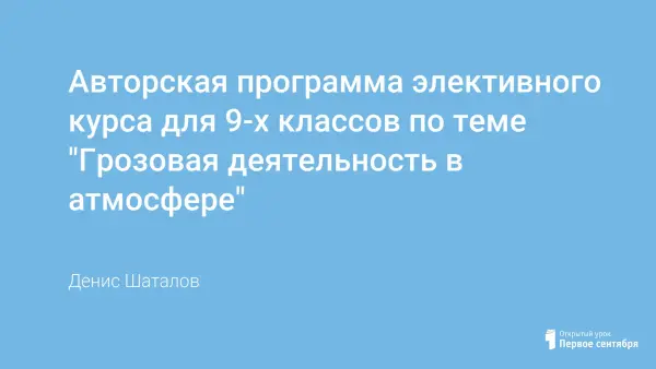 Элективный курс "Грозовая деятельность в атмосфере" предназначен для предпрофильной подготовки учащихся 9-х классов (17 часов), является предметно-ориентированным и посвящен такому интересному физическому процессу, как электрический ток в природных условиях. Кроме того, данный курс способствует формированию научного мировоззрения учащихся, в особенности по теме электрического взаимодействия атмосферы и земной поверхности.