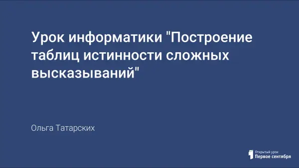 В статье представлен конспект урока, который может использоваться при изучении темы «Логика» в старших классах. Использовано методическое пособие «Логика в информатике», авторы В.Лыскова, Е.Ракитина.