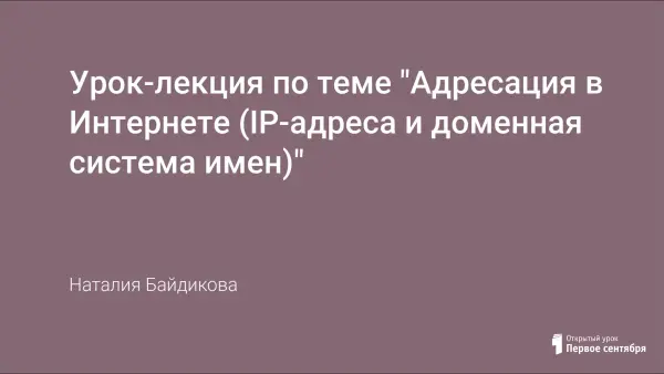 Что такое IP-адрес и доменное имя компьютера? На эти вопросы отвечаем на уроке-лекции, с демонстрацией презентации, выполненной в PowerPoint. В конце урока учащиеся сами учатся определять IP-адрес своего компьютера в сети.