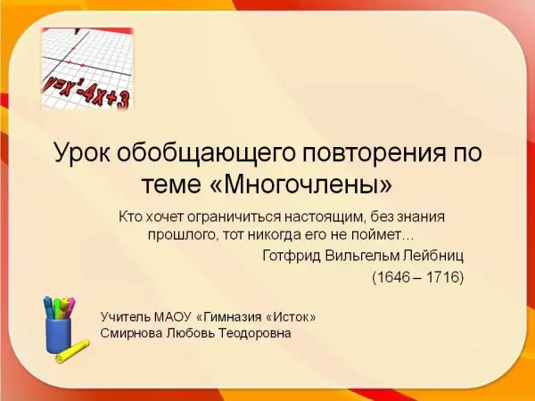 Цель урока: обобщить знания учащихся по теме «Многочлен»; познакомить учащихся с некоторыми фактами биографии знаменитого французского математика, философа и физиолога Рене Декарта. Используются компьютер, проектор, презентация.