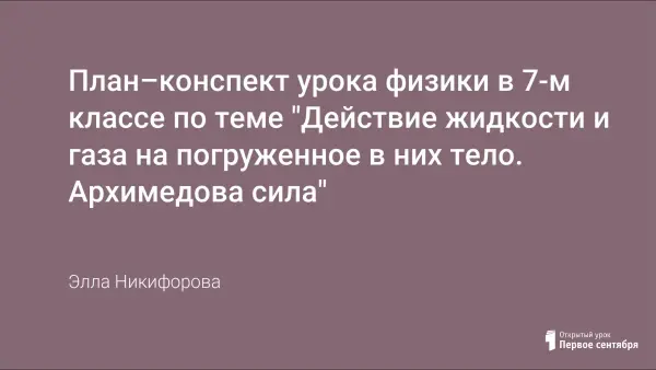 Это урок изучения нового материала. Используемое оборудование позволяет экспериментально подтвердить математический вывод закона. Проведённые опыты демонстрируют наличие, направление действия и величину выталкивающей силы.