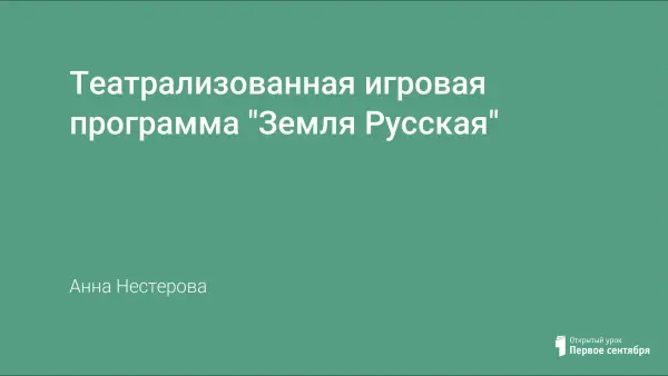 Сценарная разработка театрализованной игровой программы для детей младшего школьного возраста "Земля Русская" построена на основе фольклорного материала с использованием русских народных игр. Цель программы: приобщение детей младшего школьного возраста к русскому народному творчеству..