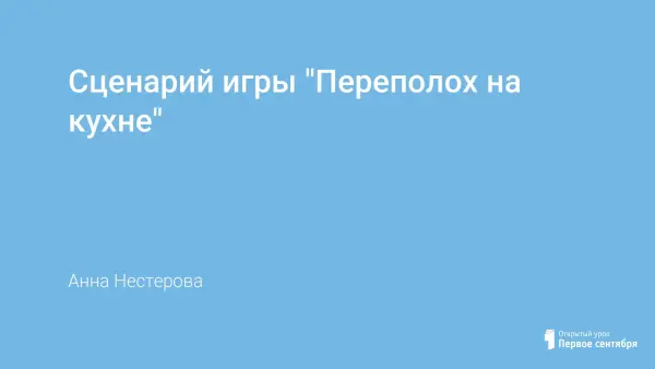 Сценарий игры "Переполох на кухне" предполагается для детей младшего школьного возраста. Ребята в игре знакомятся со значением слова "кухня", узнают, кто такие повар и поваренок. Программа может быть интересна учителям начальных классов, педагогам дополнительного образования и педагогам-организаторам. Ее можно использовать при открытии школьных столовых.
