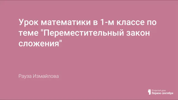 Урок математики в 1-м классе (учебник «Математика» И.И. Аргинская, Е.П. Бененсон, Л.С. Итина) призван сформировать знания, умения и навыки о переместительном законе математики, развивать анализирующее восприятие, внимание, умение писать изученные цифры. Для проверки успешности восприятия материала урока используется презентация.