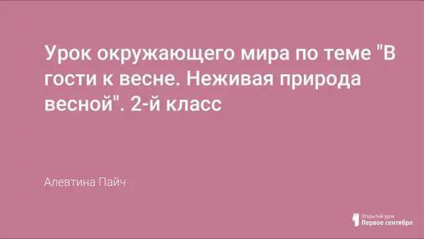 В разработке учтены личностные, регулятивные, познавательные, коммуникативные учебные действия учащихся по заявленной теме. Урок служит формированию и развитию учебно-познавательного интереса по выявлению изменений в неживой природе, связанных с наступлением весны, ценностного отношения к совместной деятельности, к умению видеть результат и подбирать способы достижения результата. Урок разработан в технологии личностно-деятельностного подхода по УМК «Школа России» в рамках ФГОС (2 поколения).