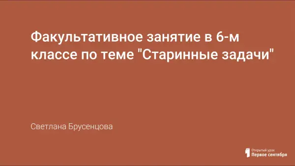 Целью занятия является развитие самостоятельности и мыслительных операций, творческих способностей учащихся. На уроке учащиеся решают старинные задачи, находят нетрадиционные пути решения задач; проводится небольшой экскурс в историю развития математики.