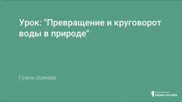Представленный урок ставит целью сформировать у детей представление о круговороте воды как важнейшем явлении в природе, увязать круговорот воды со свойствами воды (переход из одного состояния в другое). Формировать знания об экологической целостности природы. Развивать мыслительные операции: анализ, обобщение, логическое мышление, аналогия, воображение, наблюдательность.