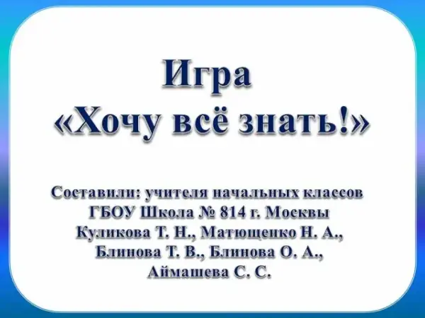 Игра «Хочу всё знать» предназначена для учащихся 1–4-х классов в качестве внеурочного занятия или клубного часа в ГПД. Посвящена Дню российской науки, может быть также использована при проведении предметной недели в начальной школе. Данная игра развивает познавательную активность учащихся, формирует положительную мотивацию к учению.