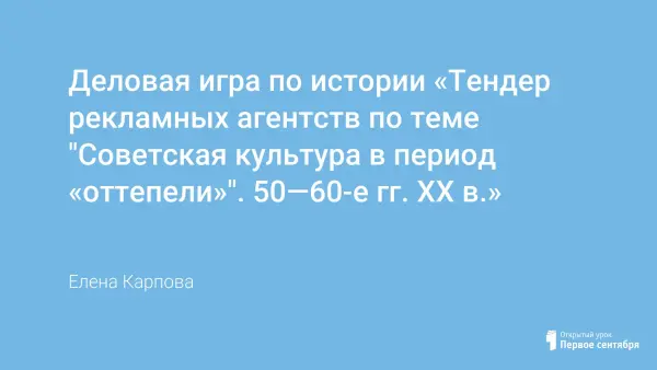 Внеклассное мероприятие для учеников 11-го класса по курсу истории России проводится в нетрадиционной форме тендера рекламных агентств. Задача мероприятия: расширяя рамки учебника, познакомить учащихся с достижениями и проблемами в сфере советской культуры в 50–60-е годы XX века.