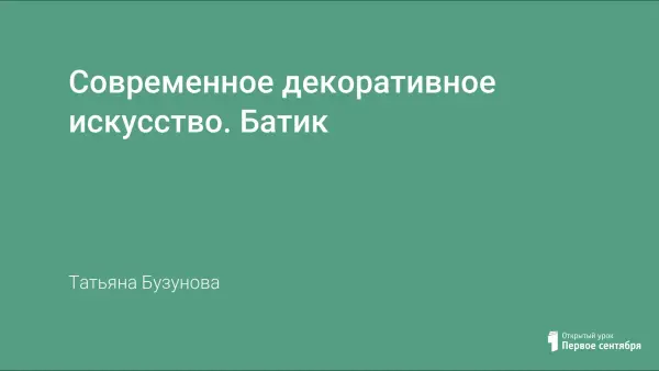 Данный урок - один из уроков по теме "Современное повседневное и выставочное декоративное искусство". С методической точки зрения урок лучше начать со знакомства с различными современными видами искусства, а затем переходить к знакомству с искусством украшения тканей, в том числе с искусством батика. Презентация PowerPоint "Современное декоративное искусство. Батик" вбирает в себя все: наглядность, красочность, доступность.