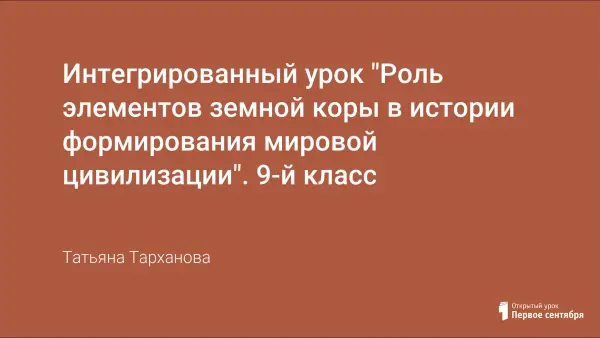 Интегрированный урок в 9-м классе. Цель: выявить роль основных элементов земной коры (металлов и соединений кремния) в истории формирования мировой культуры; познакомить с развитием культуры Древней Руси; показать, что древнерусская культура впитала в себя культурные достижения ближайших своих соседей и народов, но древнерусские мастера стремились оставаться оригинальными.