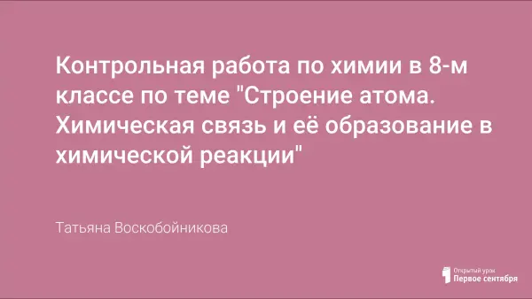 Целью занятия является проверка знаний и умений по темам «Строение атома. Химическая связь и её образование в химической реакции». Контрольная работа составлена на основании психологических особенностей учащихся, требований программы по химии.
