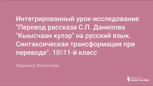 Цель урока: познакомить учащихся с рассказом С.П. Данилова «Кыысчаанкулэр», его переводом на русский язык С.Виленским; выявить, сохранена ли авторская идея в переводе рассказа; закрепить знание термина "трансформация" при переводе на практике; умение находить в тексте синтаксические средства выразительности, определять их роль; выяснить, какова роль переводческой деятельности в развитии литературы.