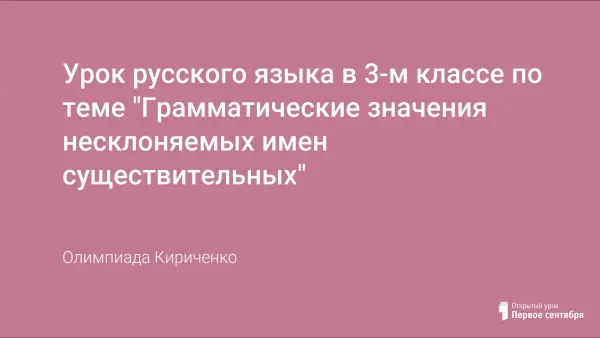 Определение грамматических значений существительных, заимствованных из иностранных языков, – труднейшая тема для учеников начальной школы. Цели урока – на основе оценки собственных знаний об имени существительном сделать вывод о том, что грамматические значения несклоняемых имен существительных определяются при помощи слов, зависящих от имени существительного.