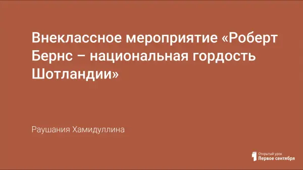 Внеклассное мероприятие посвящено жизни и творчеству великого шотландского поэта Роберта Бернса. Поэзия Роберта Бернса воспитывает молодых читателей в духе патриотизма, чести, гордости за свою родину, людей труда. Мероприятие воспитывает толерантность к культуре другого народа.