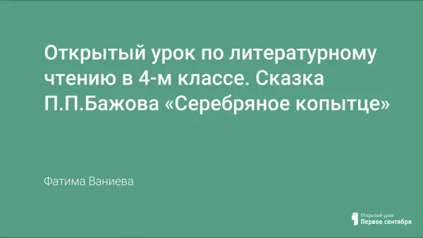 Цели урока: продолжить знакомство с жизнью и творчеством Павла Петровича Бажова, проверить знания произведения Бажова “Серебряное копытце”; совершенствовать навык беглого чтения; обогащать словарный запас; развивать внимание учащихся; учить составлению портретной характеристики героев; закрепить понятие сказа как эстетического жанра литературы, выявить его особенности в сопоставлении со сказкой; воспитывать чувство внимания друг к другу, к животным, к природе.