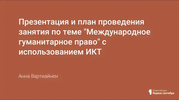 В статье подробно описано 2-часовое занятие, которое включает в себя: беседы, дискуссию, работу в группах, коллективную творческую деятельность. В презентации рассматриваются понятия: МГП; Женевская конвенция; "субъекты" и "объекты" в условиях вооруженного конфликта и др.