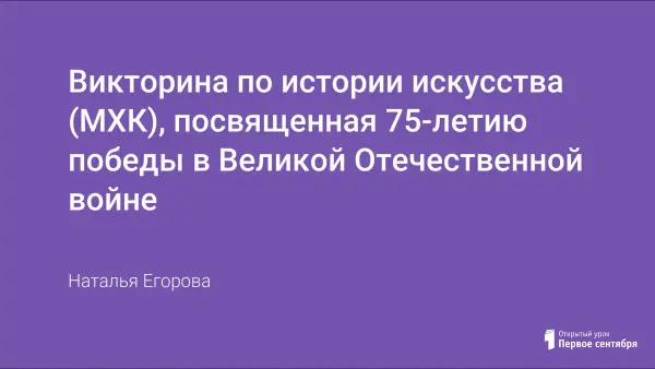 Цель викторины: активизация познавательного интереса учащихся по теме искусства времен Великой Отечественной войны. Данную викторину можно использовать как самостоятельный материал для внеурочного мероприятия, так и составной частью блока мероприятий к знаменательной дате.