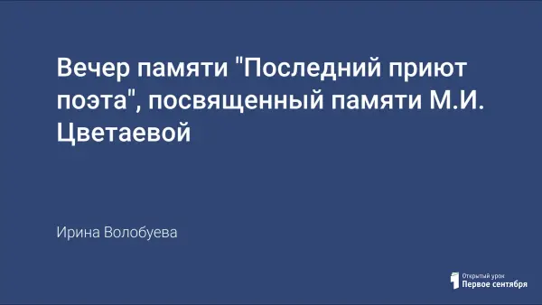 Вечер для учащихся 10–11-х классов. Автор стремится вызвать интерес к жизни и творчеству М.Цветаевой, вызвать интерес к исследовательской деятельности. Вместе с Мариной пережить те последние трагические дни, воспитывать уважение к человеку, чувства сострадания и сопереживания.