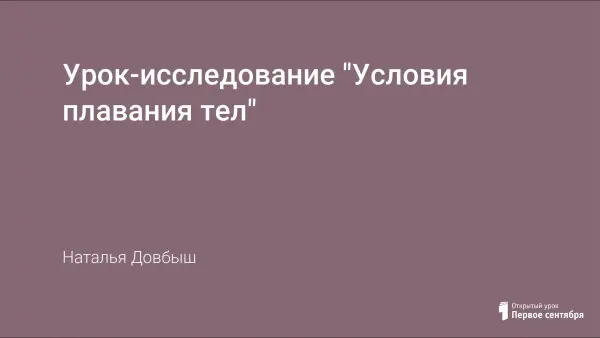 Урок-исследование в 7-м классе служит выяснению условий плавания тел в зависимости от плотности жидкости и тела и усвоению их на уровне понимания и применения, с использованием логики научного познания.