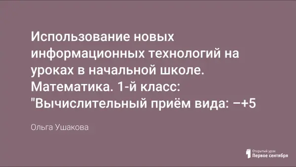 Статья повествует об использовании новых информационных технологий на уроках в начальной школе. Использование на уроке мультимедийного проектора и проведение уроков-презентаций. В качестве примера рассматривается фрагмент мультимедийного пособия по математике – урок-презентация «Вычислительный прием вида: –+5».