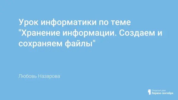 Цель урока: раскрыть суть информационного процесса хранения информации; ввести понятие "память", виды памяти; раскрыть смысл понятия "носитель информации" на основе примеров; научить распознавать и называть разные виды носителей информации; ввести на интуитивном уровне понятия "файл" и "папка"; научить создавать и сохранять файлы.