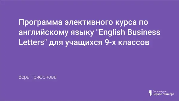 Элективный курс делового письма для учащихся 9-х классов рассчитан на 18 часов. Данный курс способствует развитию навыков письменной речи, умению составлять деловое письмо и написанию собственного резюме. Позволит учащимся овладеть основами делового общения на английском языке.