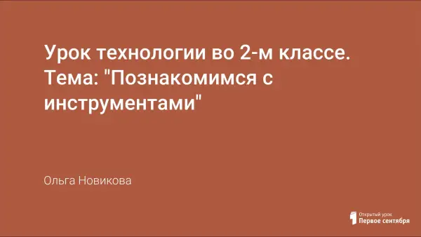 Урок технологии во 2-м классе по учебнику «Ступеньки к мастерству», автор Е.А. Лутцева посвящен знакомству с инструментами: линейкой, угольником, циркулем, канцелярским ножом, иглой, лекалом. Учащиеся изучают их названия, функциональное назначение, устройство, приёмы работы ими. На уроке объясняются правила безопасного обращения с колющими и режущими инструментами.