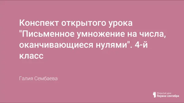 Представлен конспект открытого урока математики в 4-м классе, построенного в форме путешествия. Цель урока: познакомить с письменными приемами умножения на число, оканчивающееся нулями.