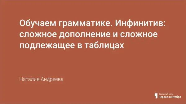 Изучая в старших классах грамматическую тему «Инфинитив», многие учащиеся испытывают трудности при усвоении оборотов «сложное дополнение» и «сложное подлежащее». Мне представляется целесообразным представить теорию компактно в виде двух таблиц, расположив их на разворотах тетрадного листа так, чтобы все случаи употребления оборотов были перед глазами ученика одновременно.
