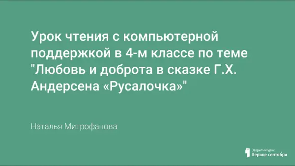 Урок-путешествие в Данию, знакомство с народом и традициями этой страны. Погружаясь в сказочный мир, ученики получают представление о писателе Г.Х. Андерсене как сказочнике, о его произведениях, проводят сравнительный анализ героини произведения и мифологической русалочки, раскрывают тему любви в произведении.