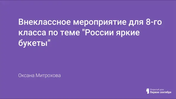 Данное внеклассное мероприятие в 8-м классе знакомит учащихся с историей художественного промысла по изготовлению подносов Жостово; развивает творческую и познавательную активность, фантазию, художественный вкус; формирует навыки работы с художественными материалами (кистью, красками); воспитывает любовь и интерес к родной культуре, истории, традициям.
