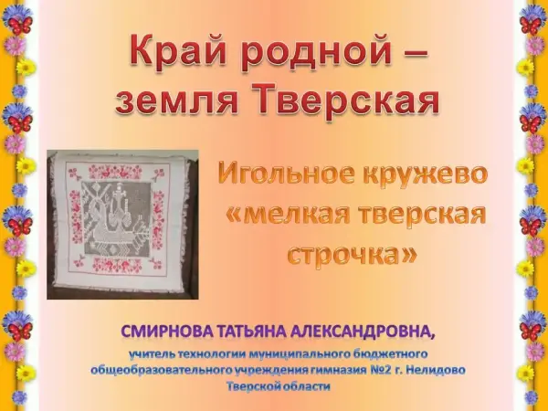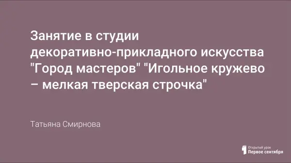 Занятие знакомит учащихся с тверским кружевоплетением, его особенностями; видами; готовит учащихся к проектной деятельности, совершенствует навыки работы с игольным кружевом.