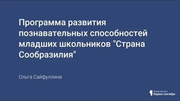 Программа «Страна Сообразилия» рассчитана на обучение и развитие детей младшего школьного возраста в системе дополнительного образования и предполагает четыре года обучения. Цель программы – диагностировать и развивать познавательные процессы у детей, формировать навыки мыслительной деятельности и самоорганизации, способствовать созданию в классе доброжелательной атмосферы, снятию излишней напряженности.