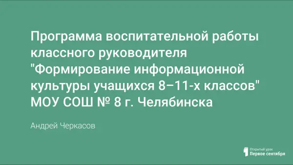 Программа воспитательной работы "Формирование информационной культуры учащихся 8-11-х классов" направлена на воспитание ученика, адаптированного к условиям современного информационного общества, способного успешно и умело использовать все информационные ресурсы для достижения жизненных целей.