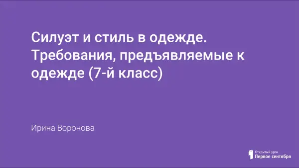 Урок является первым для учащихся 7-х классов по разделу «Конструирование и моделирование плечевого изделия». Цели урока: способствовать формированию представления о силуэте и стиле в одежде; познакомить с видами лёгкого женского платья и бельевых изделий; с эстетическими, гигиеническими и эксплуатационными требованиями к одежде; способствовать формированию и развитию познавательного интереса у учащихся к предмету; развитию речи, обогащению словарного запаса; развивать пространственное воображение, творческое мышление, эстетический вкус.