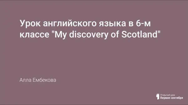 Урок представлен в виде виртуальной экскурсии, заочного путешествия по Шотландии. Основной обучающей задачей на уроке является развитие речевых умений на основе творческого использования ранее усвоенного материала в новых ситуациях общения. Практической задачей учащихся является составление путеводителя по Эдинбургу, русско-английского разговорника на основе прочитанного текста.