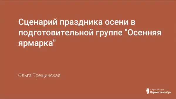 Предлагаемый сценарий позволяет ознакомить детей с такой старинной русской традицией, как проведение осенних ярмарок. В ходе подготовки можно рассказать воспитанникам о народных промыслах, ярмарочных скоморохах и раёшниках. Особо следует подчеркнуть, что осенняя ярмарка – это всегда праздник урожая. Сценарий структурирован таким образом, что можно, не нарушая логики, вставить стихотворные или музыкальные фрагменты, дополнить игрой. Однако следует учитывать, что при проведении мероприятия в оптимальном темпе, оно длится 40–45 минут, Такое время считается наиболее рациональным для детей 6–7 лет.